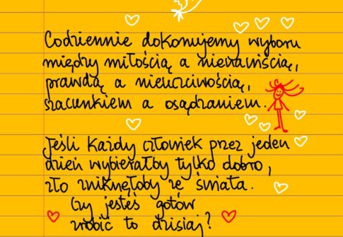Codziennie przy wielu drobnych okazjach dokonujemy wyboru między miłością a nienawiścią, między prawdą a nieuczciwością, między szacunkiem a osądzaniem. Jeśli każdy człowiek przez jeden dzień wybierałby tylko dobro, zło zniknęłoby ze świata. Czy jesteś gotów podjąć się takiego zadania na jeden cały dzień? Dzisiaj od rana? Każde wielkie dobro i przemiana całego świata zaczyna się