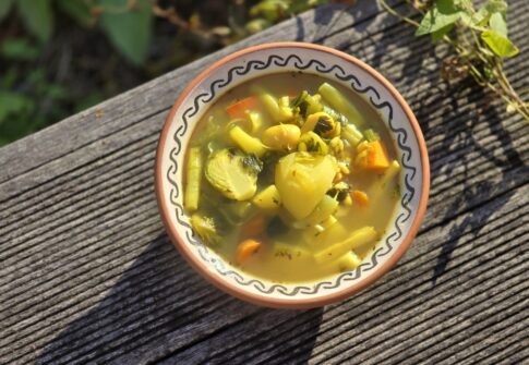 Przygotowałam dzisiaj pyszną zupę: sezonowe polskie warzywa, kasza pęczak, tymianek, lubczyk i rozgrzewająca kurkuma – idealne danie na jesień! Ziemniaki, dynia, fasolka szparagowa, brukselka, marchewka, kapusta, pietruszka, seler i por – bogactwo witamin, minerałów i substancji fitochemicznych. Zupa jest łatwa do zrobienia, a jej przygotowanie zajmie piętnaście minut + ok. 25 minut oczekiwania aż warzywa