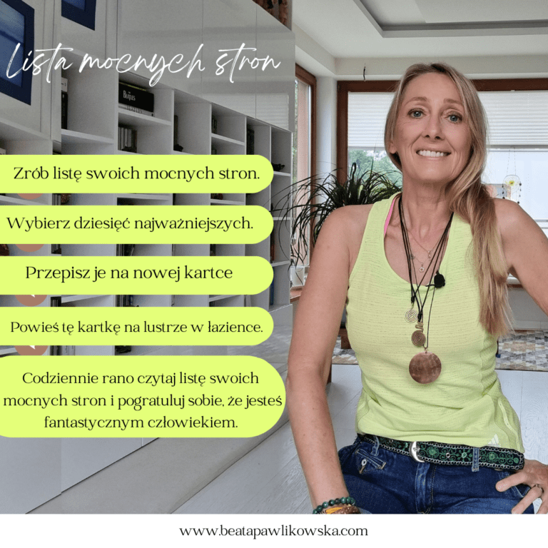 • Zrób listę swoich mocnych stron. • Wybierz z nich dziesięć najważniejszych. • Przepisz je na nowej kartce. • Powieś tę kartkę na lustrze w łazience. • Codziennie rano czytaj listę swoich mocnych stron i pogratuluj sobie, że jesteś fantastycznym…