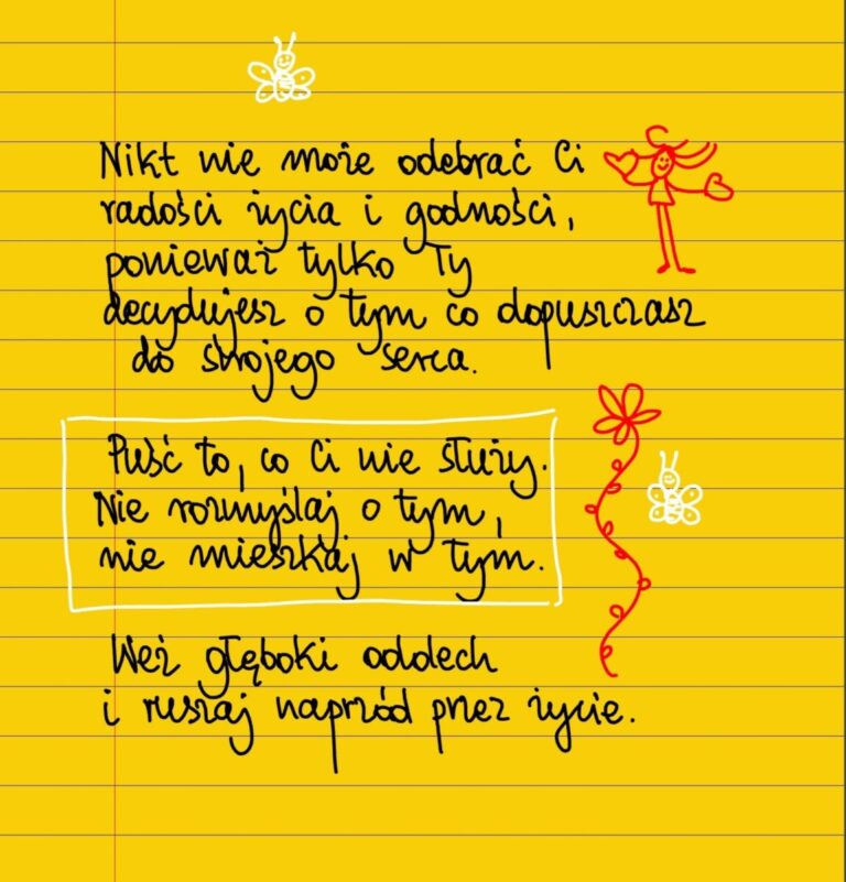 Nikt nie może odebrać ci radości życia i poczucia godności, ponieważ tylko Ty decydujesz o tym co dopuszczasz do swojego serca,. Puść to co Ci nie służy. Nie rozmyślaj o tym, nie mieszkaj w tym. Ruszaj dalej naprzód przez swoje…