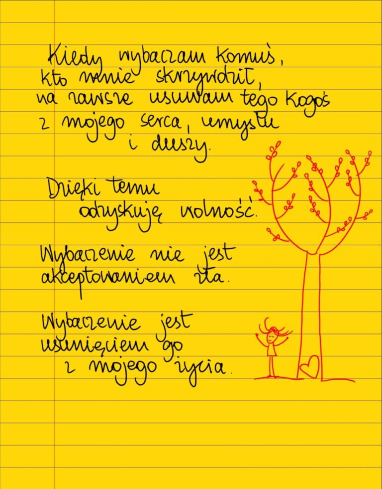 Kiedy wybaczam komuś, kto mnie skrzywdził, na zawsze usuwam tego kogoś z mojego serca, umysłu i duszy. Dzięki temu odzyskuję wolność. Wybaczenie nie jest akceptowaniem zła. Wybaczenie jest usunięciem go z mojego życia. #żółtakartka