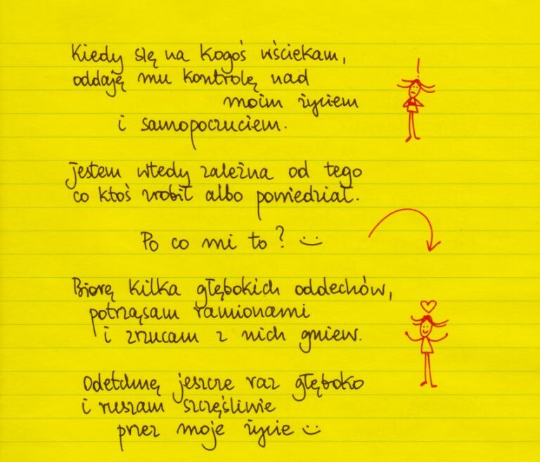 Kiedy się na kogoś wściekam, oddaję mu kontrolę nad moim życiem i samopoczuciem. Jestem wtedy zależna od tego co ktoś zrobił albo powiedział. Po co mi to? 🙂 Zamiast tego biorę kilka głębokich oddechów, potrząsam ramionami i wrzucam z nich…