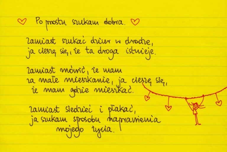 Po prostu szukam dobra. Zamiast szukać dziur w drodze, ja się cieszę, że ta droga istnieje. Zamiast mówić, że mam za małe mieszkanie, ja cieszę się, że mam gdzie mieszkać. Zamiast siedzieć i płakać, ja szukam sposobu naprawienia mojego życia.…