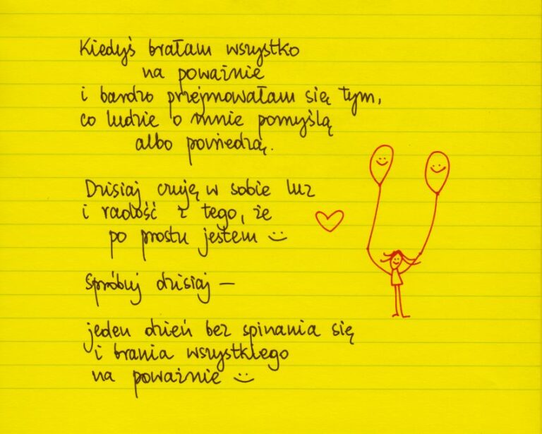 Kiedyś brałam wszystko na poważnie i bardzo przejmowałam się tym co ludzie o mnie pomyślą albo powiedzą. Dzisiaj czuję w sobie luz i radość z tego, że po prostu jestem 🙂 Spróbuj dzisiaj – jeden dzień bez spinania się i…