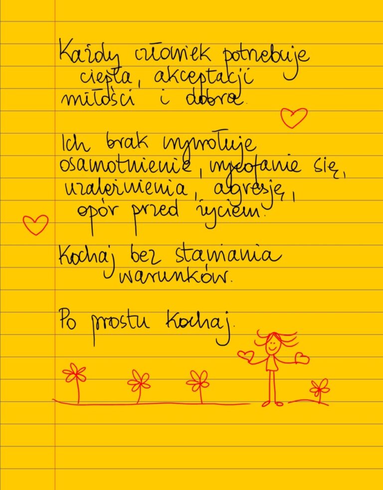 Każdy człowiek potrzebuje ciepła, akceptacji, milości i dobra. Ich brak wywołuje osamotnienie, wycofanie się, agresję, uzależnienia, opór przed życiem. Kochaj bez stawiania warunków. Po prostu kochaj. #żółtakartka
