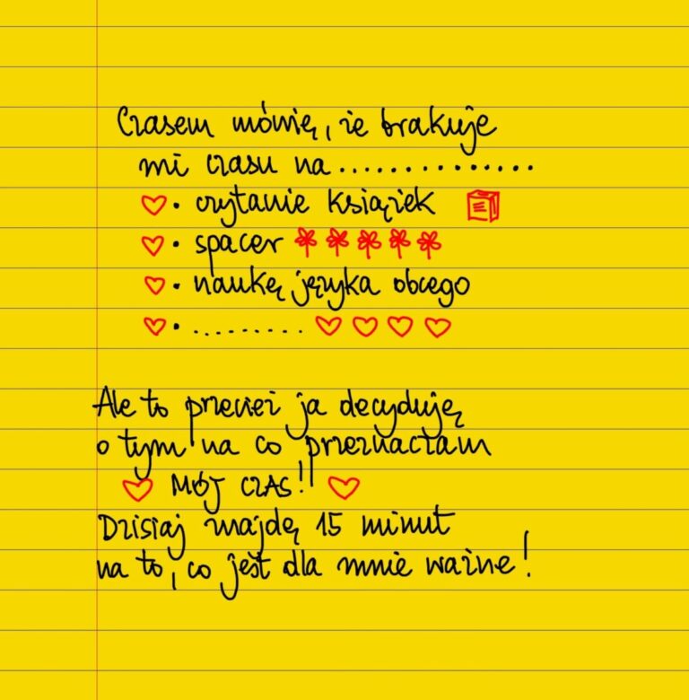 Czasem mówię, że brakuje mi czasu na… czytanie książek/spacer/naukę języka obcego Ale przecież to ja decyduję o tym na co przeznaczam mój czas! Dzisiaj znajdę co najmniej 15 minut na to, co jest dla mnie ważne! 😊#żółtakartka