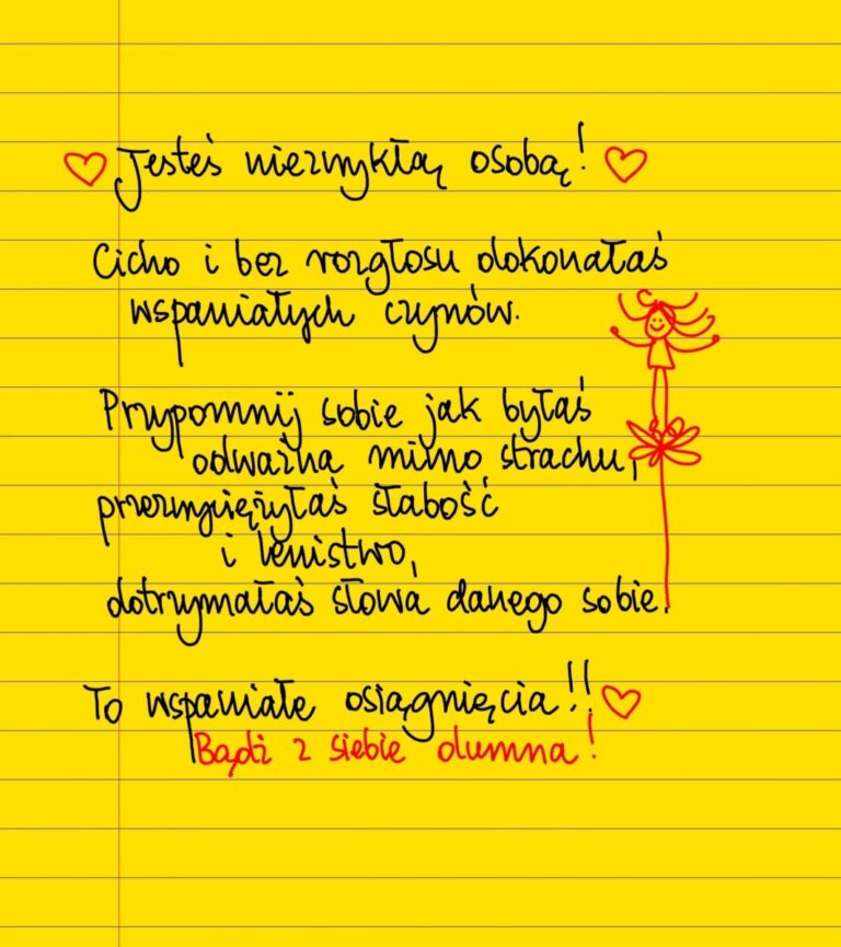 Jesteś niezwykłą osobą! Cicho i bez rozgłosu dokonałaś wspaniałych czynów. Przypomnij sobie dzisiaj jak byłaś odważna mimo strachu, przezwyciężyłaś swoją słabość albo lenistwo, dotrzymałaś słowa danego samej sobie. To wspaniałe osiągnięcia! Bądź z siebie dumna! #żółtakartka
