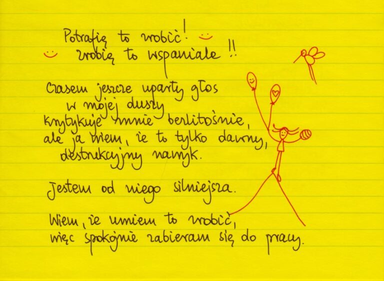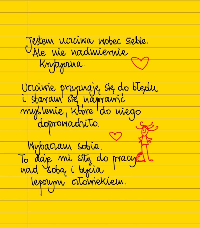 Jestem uczciwa wobec siebie. Ale nie nadmiernie krytyczna. Uczciwie przyznaję się do błędu i staram się naprawić myślenie, które do niego doprowadziło. Wybaczam sobie. To daje mi siłę do pracy nad sobą i bycia lepszym człowiekiem.