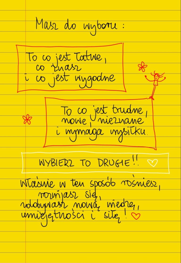 Masz do wyboru: To co jest łatwe, co znasz i co jest wygodne. Albo to co jest trudne, nowe, nieznane i wymaga wysiłku. WYBIERZ TO DRUGIE.Właśnie w ten sposób rośniesz, rozwijasz się, zdobywasz nową wiedzę, umiejętności i siłę. Wybierz to…