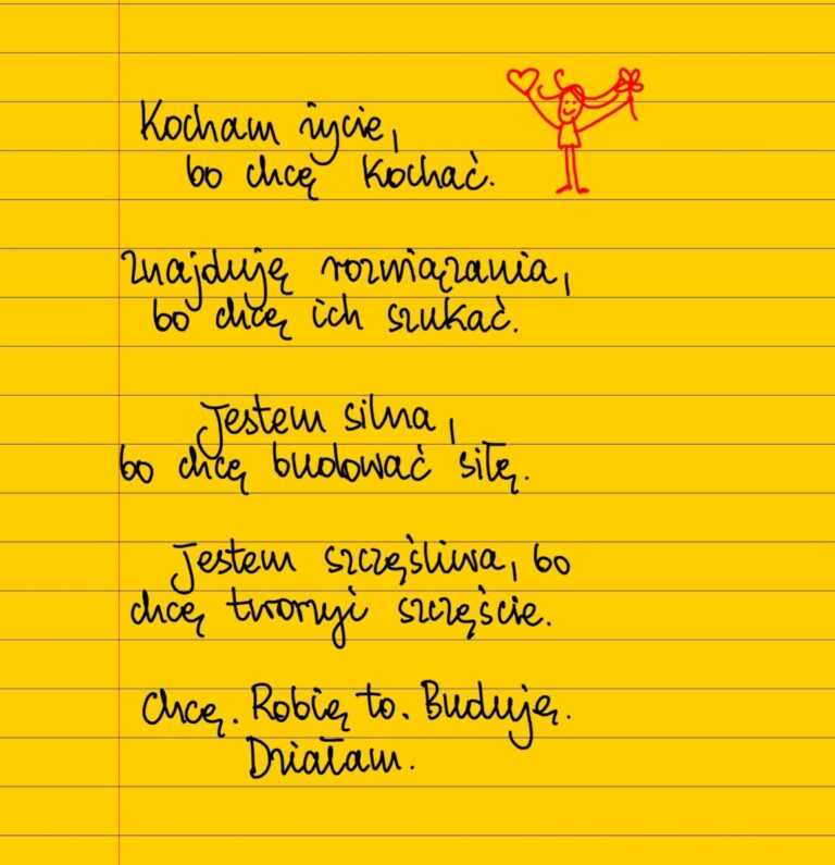Kocham życie, bo chcę kochać. Znajduję rozwiązania, bo chcę ich szukać. Jestem silna, bo chcę budować siłę. Jestem szczęśliwa, bo chcę tworzyć szczęście. Chcę. Robię to. Buduję. Działam. #żółtakartka