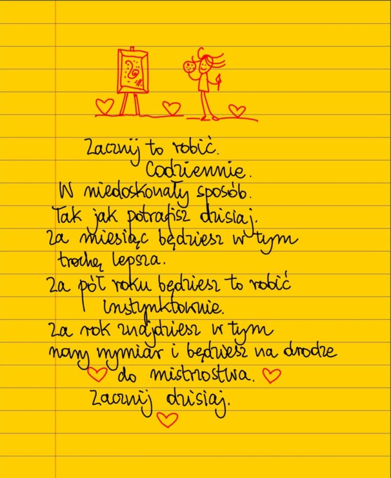 Zacznij to robić. Codziennie. W niedoskonały sposób. Tak jak potrafisz dzisiaj. Za miesiąc będziesz w tym trochę lepsza. Za pół roku będziesz to robić instynktownie. Za rok znajdziesz w tym nowy wymiar i będziesz na drodze do mistrzostwa. Zacznij dzisiaj.…