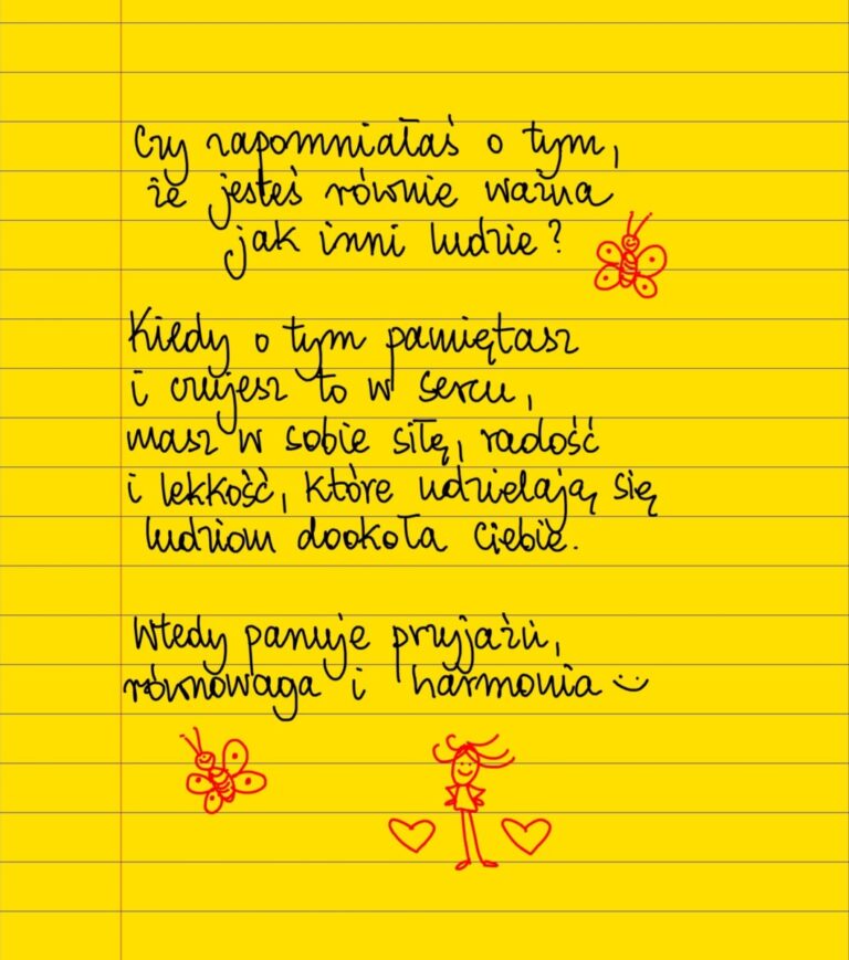 Czy zapomniałaś o tym, że jesteś równie ważna jak inni ludzie? Kiedy o tym pamiętasz i czujesz to w sercu, masz w sobie siłę, radość i lekkość, które udzielają się ludziom dookoła Ciebie. Wtedy panuje przyjaźń, równowaga i harmonia. #żółtakartka