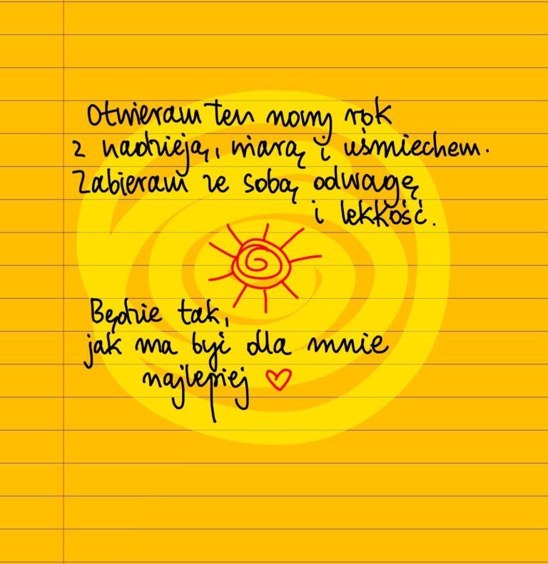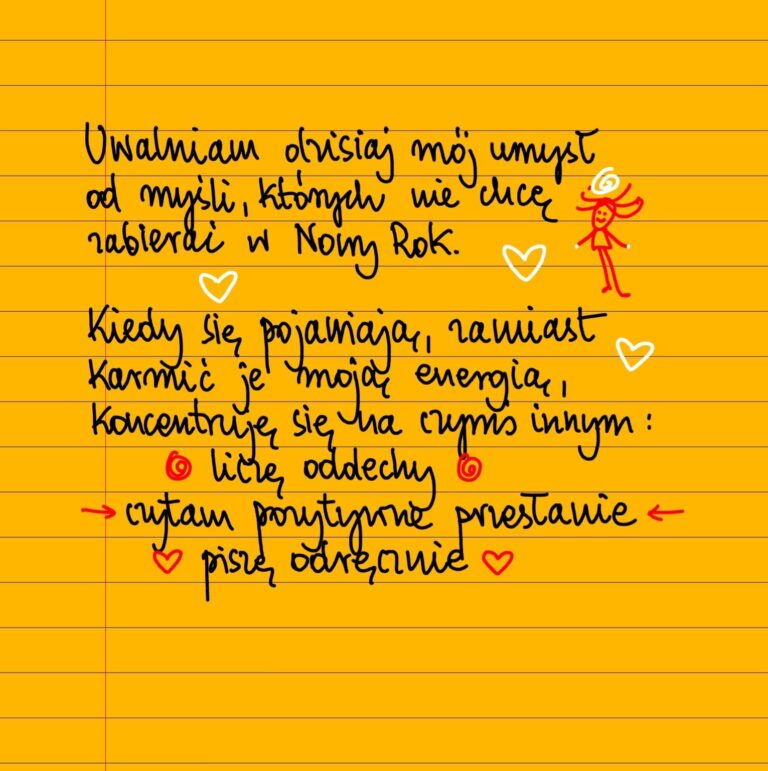 Uwalniam dzisiaj mój umysł od myśli, których nie chcę zabierać ze sobą w Nowy Rok. Kiedy się pojawiają, zamiast karmić je moją uwagą, koncentruję się na czymś innym: liczę oddechy, czytam pozytywne przesłanie, piszę odręcznie nową formułę myślenia, której chcę…