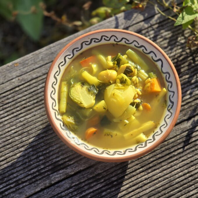 Przygotowałam dzisiaj pyszną zupę: sezonowe polskie warzywa, kasza pęczak, tymianek, lubczyk i rozgrzewająca kurkuma – idealne danie na jesień! Ziemniaki, dynia, fasolka szparagowa, brukselka, marchewka, kapusta, pietruszka, seler i por – bogactwo witamin, minerałów i substancji fitochemicznych. Zupa jest łatwa do zrobienia, a jej przygotowanie zajmie piętnaście minut + ok. 25 minut oczekiwania aż warzywa