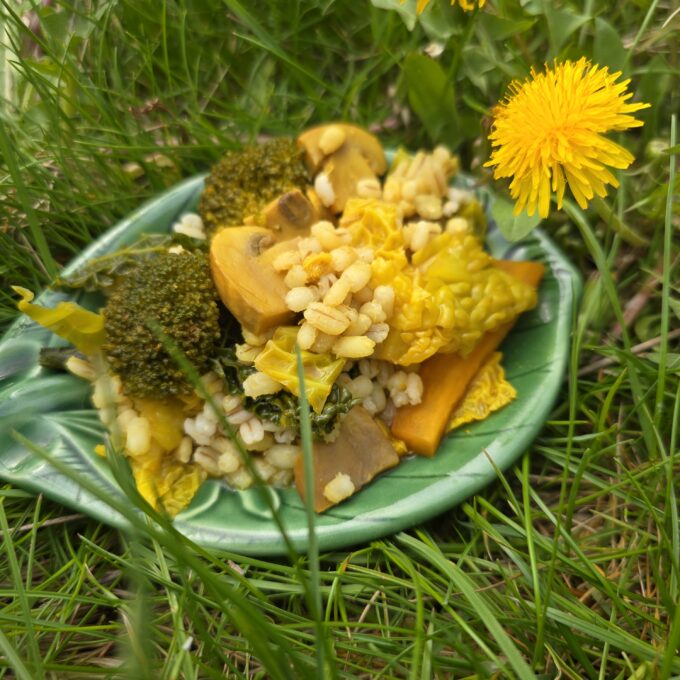 To prosty i szybki przepis z rozgrzewającymi przyprawami, świetny na obiad lub kolację. Na patelni rozgrzej olej kokosowy, dodaj pieczarki, kapustę i ziemniaki pokrojone w plasterki. Dodaj sól, pieprz i kurkumę. Dodaj pół szklanki gorącej wody, pastę miso lub sos sojowy, wymieszaj, gotuj na małym ogniu przez ok. 15 minut aż warzywa zmiękną. Dodaj ugotowaną