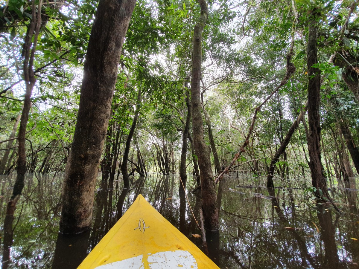 Podczas pory deszczowej w niektórych częściach Amazonii poziom wody w rzekach podnosi się nawet o kilkanaście metrów. To oznacza, że co roku o tej samej porze rzeka wylewa ze swojego koryta i zatapia dżunglę rosnącą dookoła. Jeśli wsiądziesz do czółna, pływasz między drzewami wyrastającymi z wody. Krajobraz jest nieziemski. Do tego oszałamiająca cisza. I dla cierpliwych: małpy pod koniec filmu.
