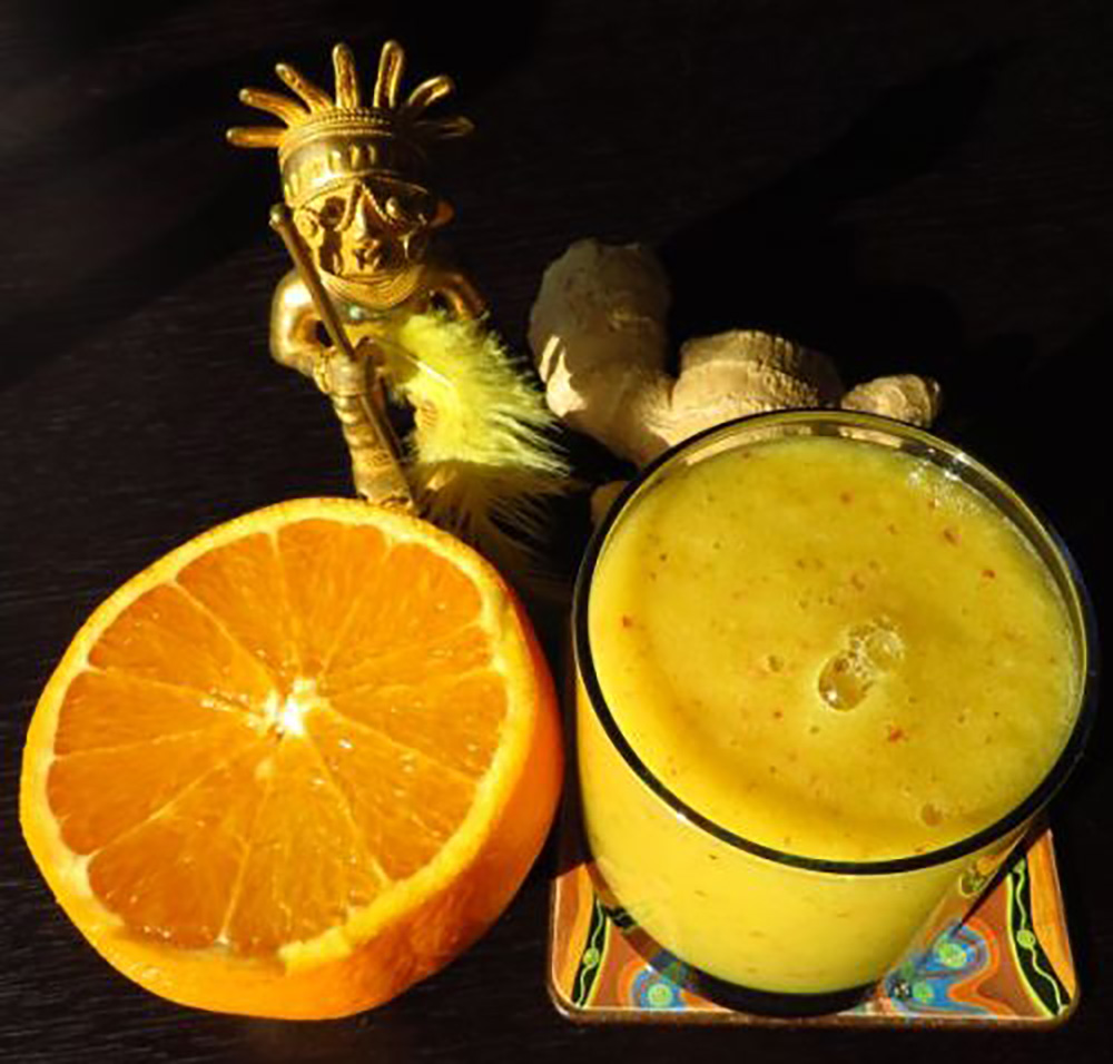 To wzmacniający sok z owoców, które są dostępne pod koniec zimy. . Pomarańczę obierz, podziel na cząstki. Gruszkę i jabłko umyj (nie obieraj), usuń pestki, pokrój na mniejsze kawałki. Imbir obierz ze skórki, pokrój w plasterki. Zmiksuj z tych składników…