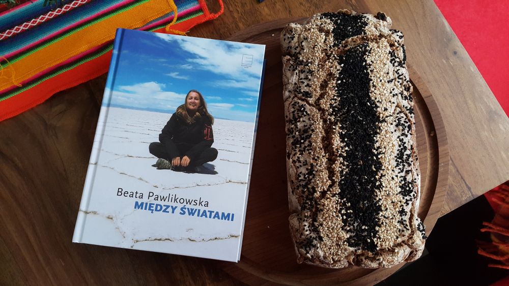 Jeszcze gorące, prosto z pieca, najświeższe wypieki 🙂 Po prawej: chleb z czarnuszką, sezamem i rodzynkami, po lewej: książka „Między światami”, dzisiaj w specjalnej promocji