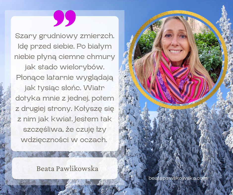 Szary grudniowy zmierzch. Idę przed siebie. Po białym niebie płyną ciemne chmury jak stado wielorybów. Płonące latarnie wyglądają jak tysiąc słońc. Wiatr dotyka mnie z jednej, potem z drugiej strony. Kołyszę się z nim jak kwiat. Jestem taka szczęśliwa. Tak bardzo, że czuję łzy wdzięczności w oczach. Ten cudny zimowy wieczór. Śnieg stopniał, droga pełna błota, czarne gałęzie drzew. Prawda jest piękna niezależnie od tego jak wygląda. Czy wiosenną burzą stokrotek, czy letnim strumykiem, czy jabłoniami pełnymi owoców na jesieni. Jestem wdzięczna za zimę, za ten dzień, ten wieczór, za moje życie, za powietrze, za każdy pomysł i działanie, jakie podejmę. Kocham ten czas, zabieram go w sercu do każdej sekundy, która zdarzy się w przyszłości.