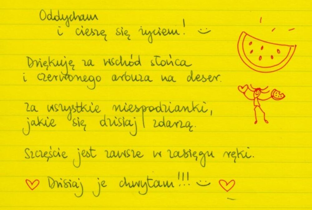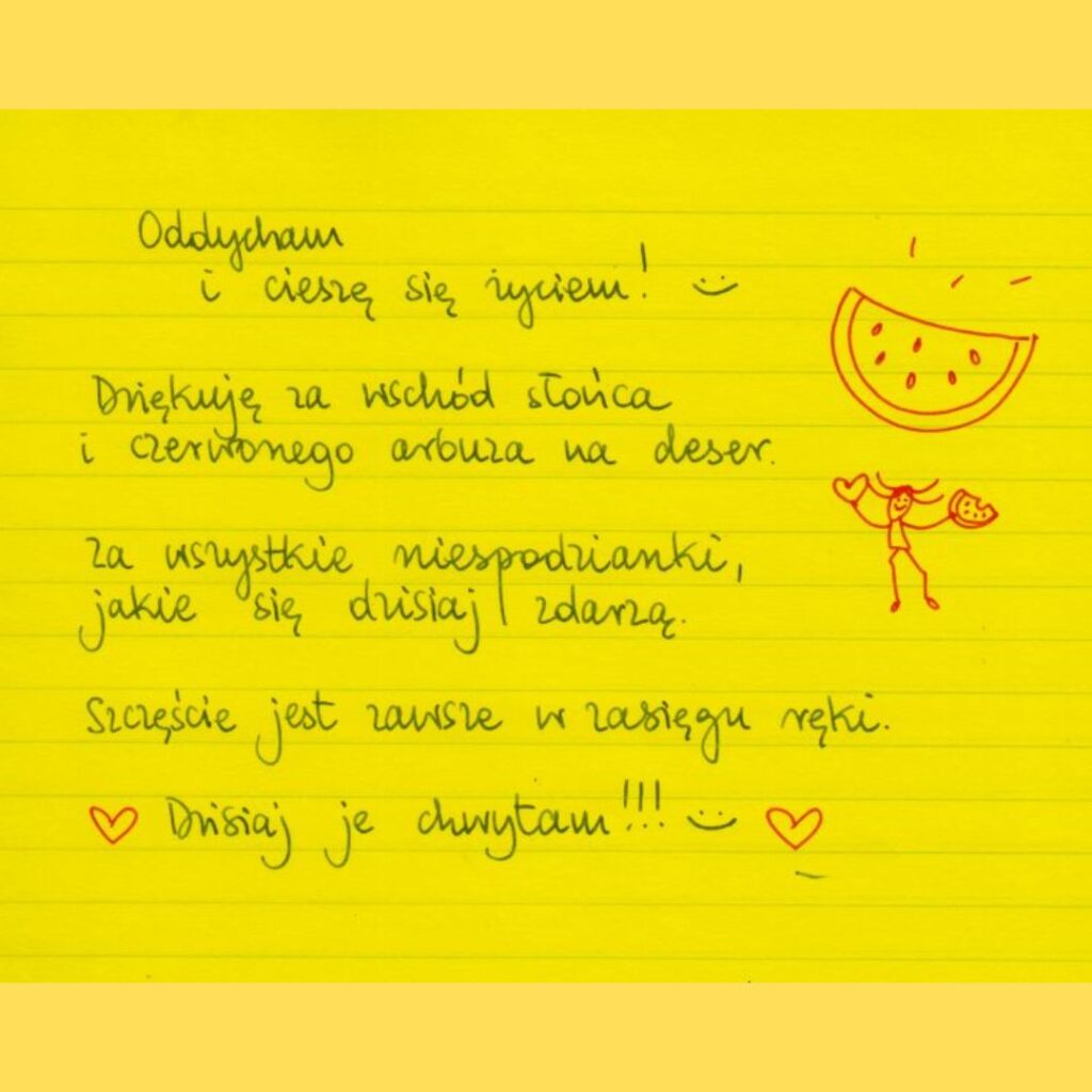 Żółte kartki Oddycham i cieszę się życiem poniedziałek, 01.09.2025 Oddycham i cieszę się życiem! Dziękuję za wschód slońca i czerwonego arbuza na deser. Za wszystkie niepoidzianki, jakie się dzisiaj zdarzą. Szczęście jest zawsze w zasięgu ręki. Dzisiaj je chwytam!!! ❤ Udostępnij na Facebooku