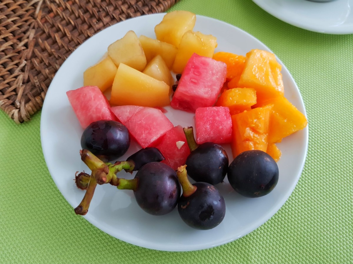 Melon, ananas, arbuz, śliwki i orzechy brazylijskie, śniadanie w Bogocie, Kolumbia