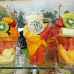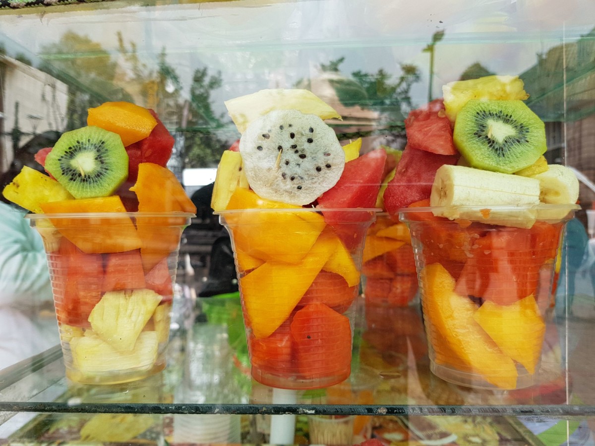 Gotowe do zjedzenia porcje tropikalnych owoców sprzedawane na ulicy w Bogocie, stolicy Kolumbii
