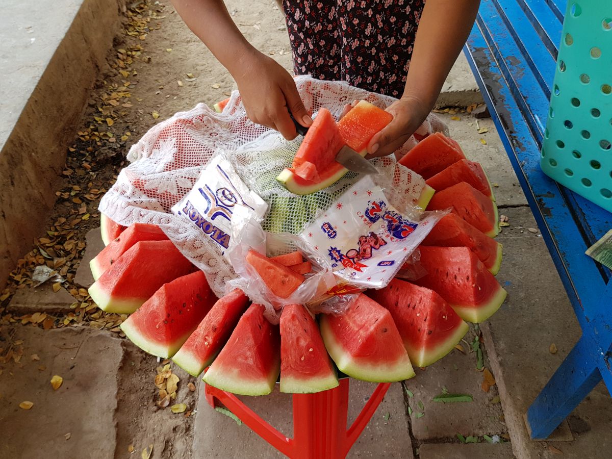 Plastry dojrzałego, słodkiego arbuza sprzedawane na dworcu kolejowym w Birmie.