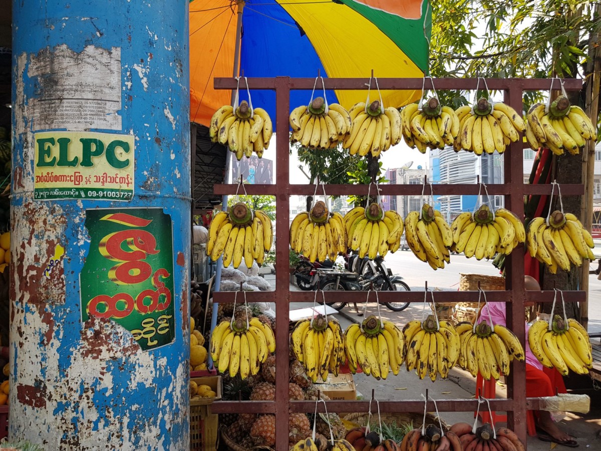 Duriany i (poniżej) owoce drzewa bochenkowego (jackfruit) sprzedawane na ulicy w Birmie