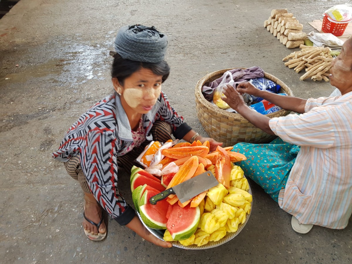 Pyszne, dojrzałe, słodkie kawałki ananasów, arbuzów i papai sprzedawane na ulicy w Birmie.