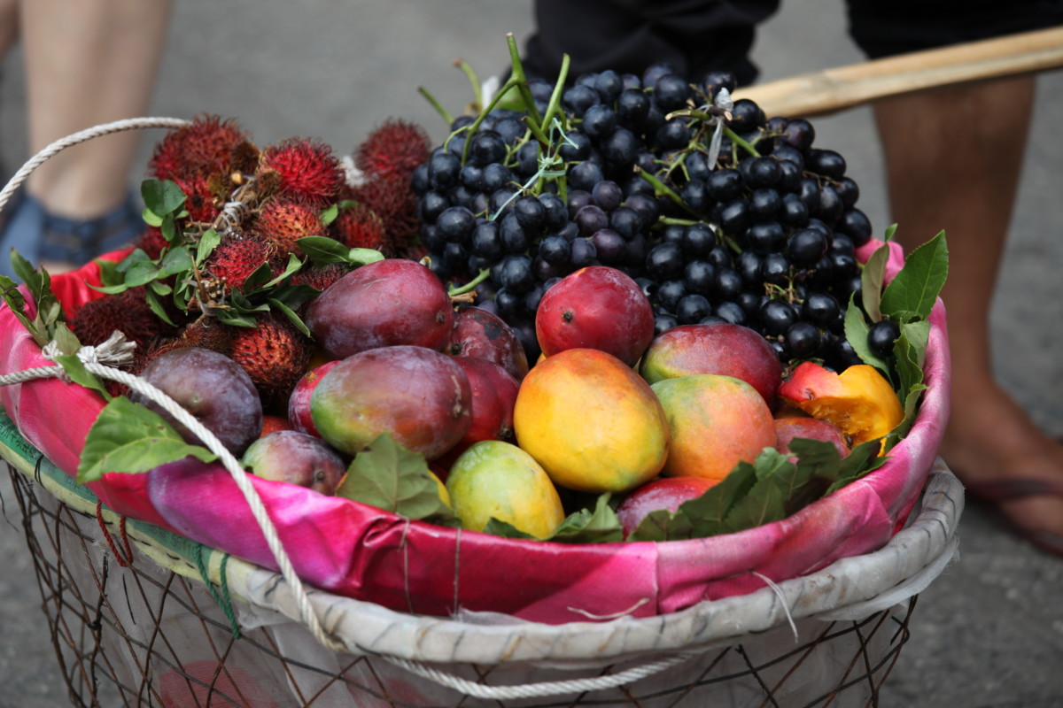 Uliczny sprzedawca owoców w Chinach. W koszyku ma rambutany, mango, śliwki i winogrona