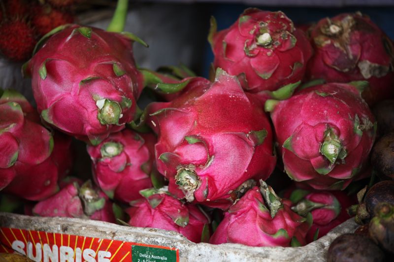 Smoczy owoc, pitahaya, ma biały miąższ w czarne kropki, w smaku delikatny i słodki, Kambodża