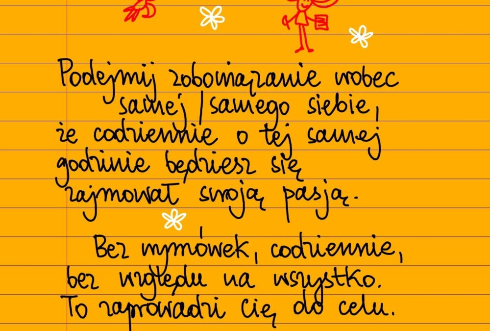 Żółte kartki Podejmij zobowiązanie wobec siebie poniedziałek, 27.10.2025 Podejmij zobowiązanie wobec samej/samego siebie, że codziennie o tej samej godzinie będziesz zajmował się swoją pasją. Bez wymówek, codziennie, bez względu na wszystko. To zaprowadzi cię do celu ❤ #żółtakartka Udostępnij na Facebooku