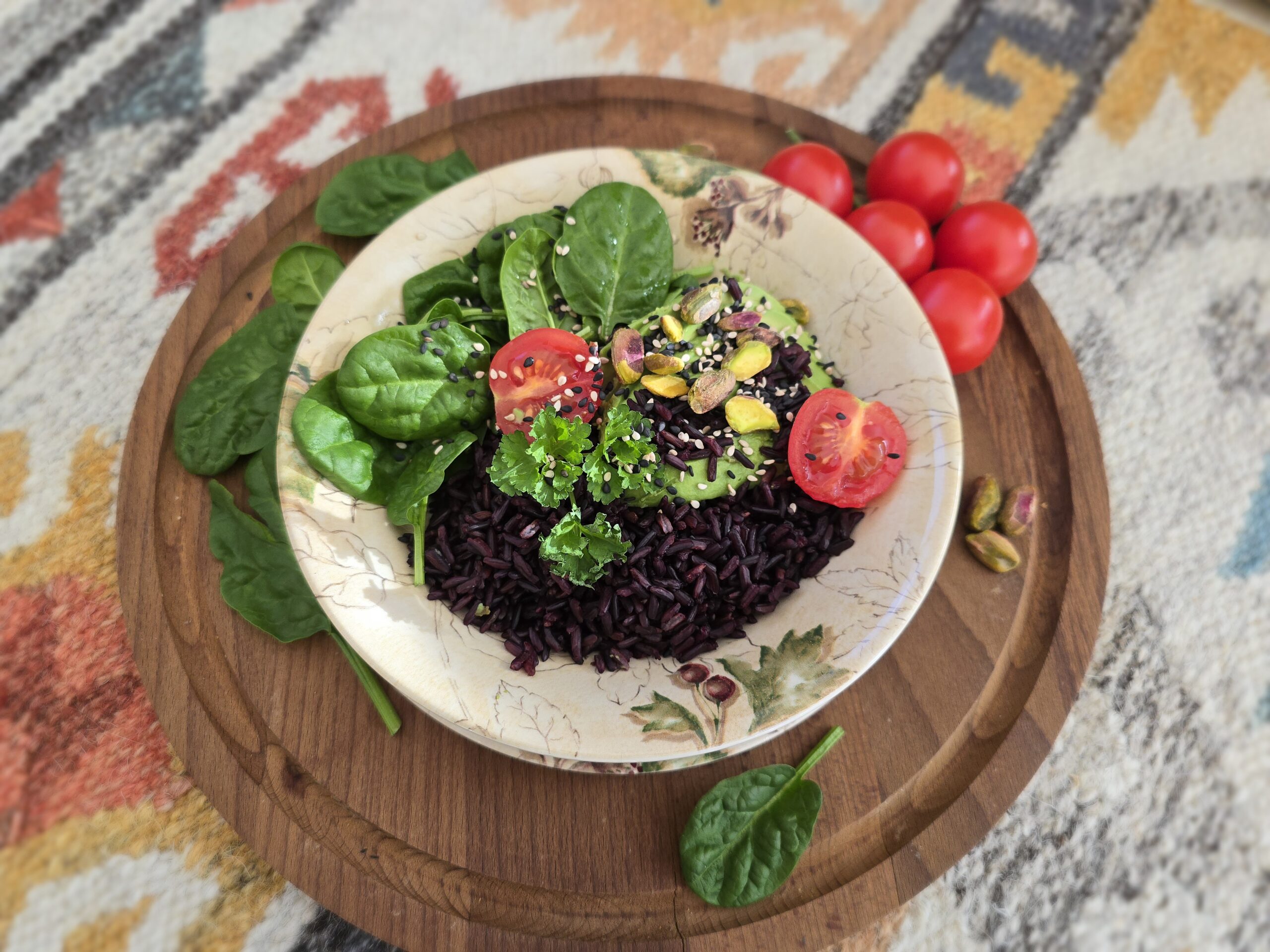 Ryż ugotuj w parowarze (opłucz, zalej niewielką ilością wody i nastaw na godzinę). Kiedy ryż będzie gotowy, dodaj oliwę i sól, wymieszaj. Rozłóż ryż na dwa talerze. Awokado rozkrój wzdłuż, łyżką wyjmij miąższ i pokrój go w plasterki, połóż obok ryżu. Dodaj opłukane liście szpinaku, pomidorki, posyp sezamem oraz pistacjami, dodaj natkę pietruszki. Smacznego!