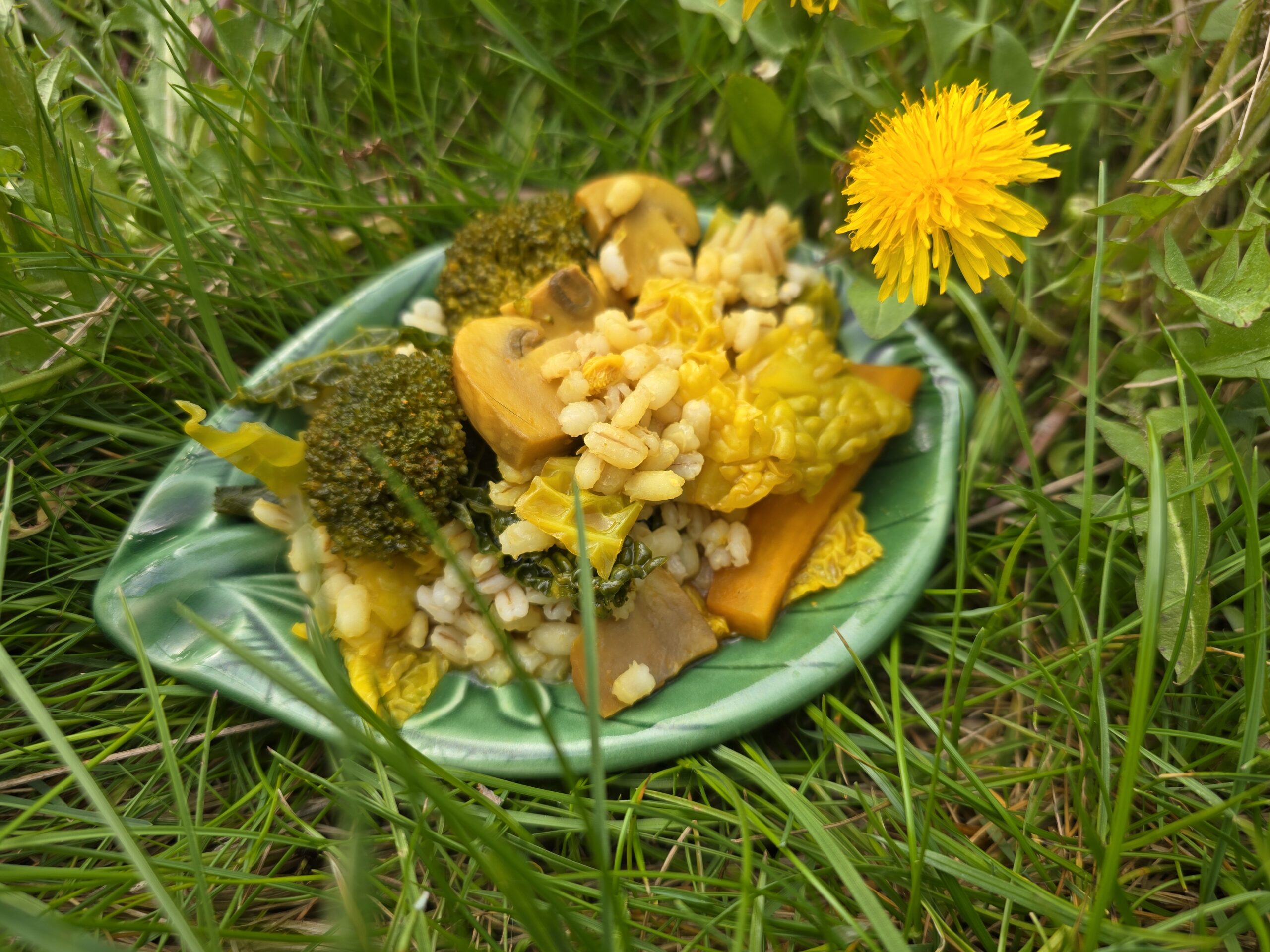 Na patelni rozgrzej olej kokosowy, dodaj pieczarki, kapustę i ziemniaki pokrojone w plasterki. Dodaj sól, pieprz i kurkumę. Dodaj pół szklanki gorącej wody, pastę miso lub sos sojowy, wymieszaj, gotuj na małym ogniu przez ok. 15 minut aż warzywa zmiękną. Dodaj ugotowaną kaszę pęczak, wymieszaj i podawaj z natką pietruszki.