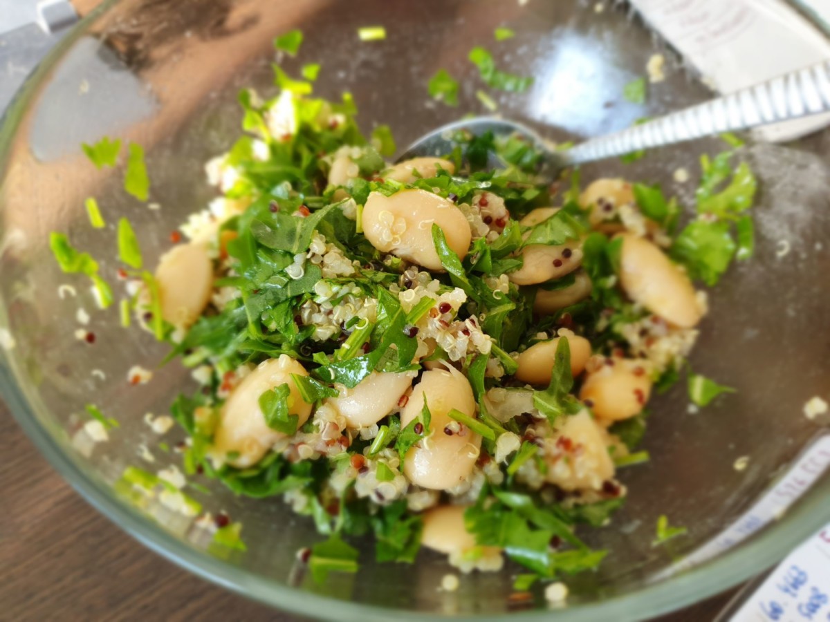 W moim ogródku właśnie wzeszła świeża rukola. W ciepły majowy dzień usiadłam na trawie obok kota Elvisa Presleya, słuchałam jak na niebie śpiewają skowronki i wpadłam na pomysł tej bardzo aromatycznej, sycącej, a jednocześnie pysznej i lekkiej sałatki.
