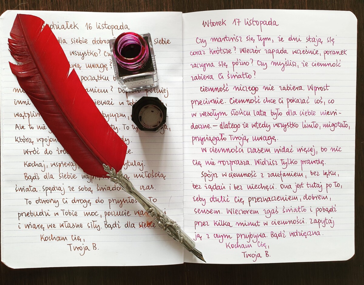 Spójrz w ciemność z zaufaniem, bez lęku, bez żądań i bez niechęci. Ona jest tutaj po to, żeby otulić Cię przeznaczeniem, dobrem, sensem. Wieczorem zgaś światło i pobądź przez kilka minut w ciemności. Zapytaj ją z czym przybywa. Bądź wdzięczna.