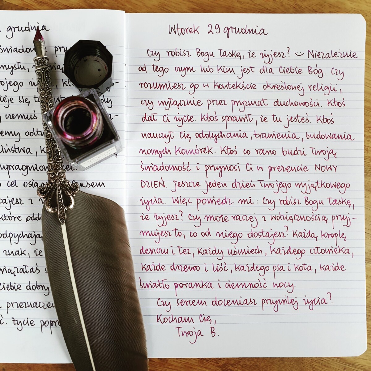 Czy może raczej z wdzięcznością przyjmujesz to, co od niego dostajesz? Każda krople deszczu i łez, każdy uśmiech, każdego człowieka, każde drzewo i liść, każdego psa i kota, każde światło poranka i ciemność nocy.