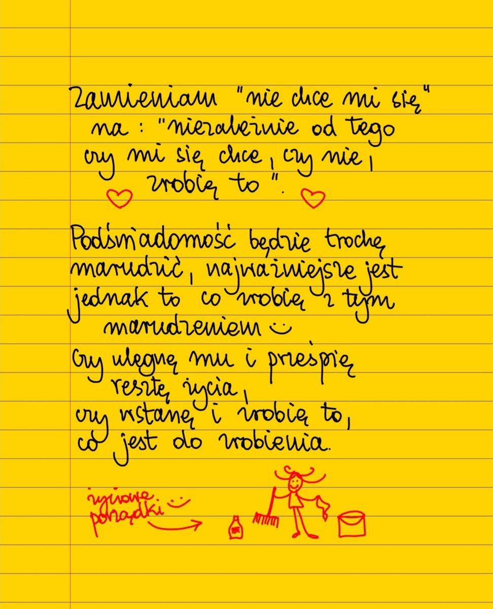 Zamieniam „nie chce mi się” na „niezależnie od tego czy mi się chce, czy nie, zrobię to!” Podświadomość może trochę marudzić, najważniejsze jednak jest to co ja z tym marudzeniem zrobię. Czy ulegnę mu i prześpię resztę życia, czy wstanę i zrobię to, co jest do zrobienia 😊 #żółtakartka